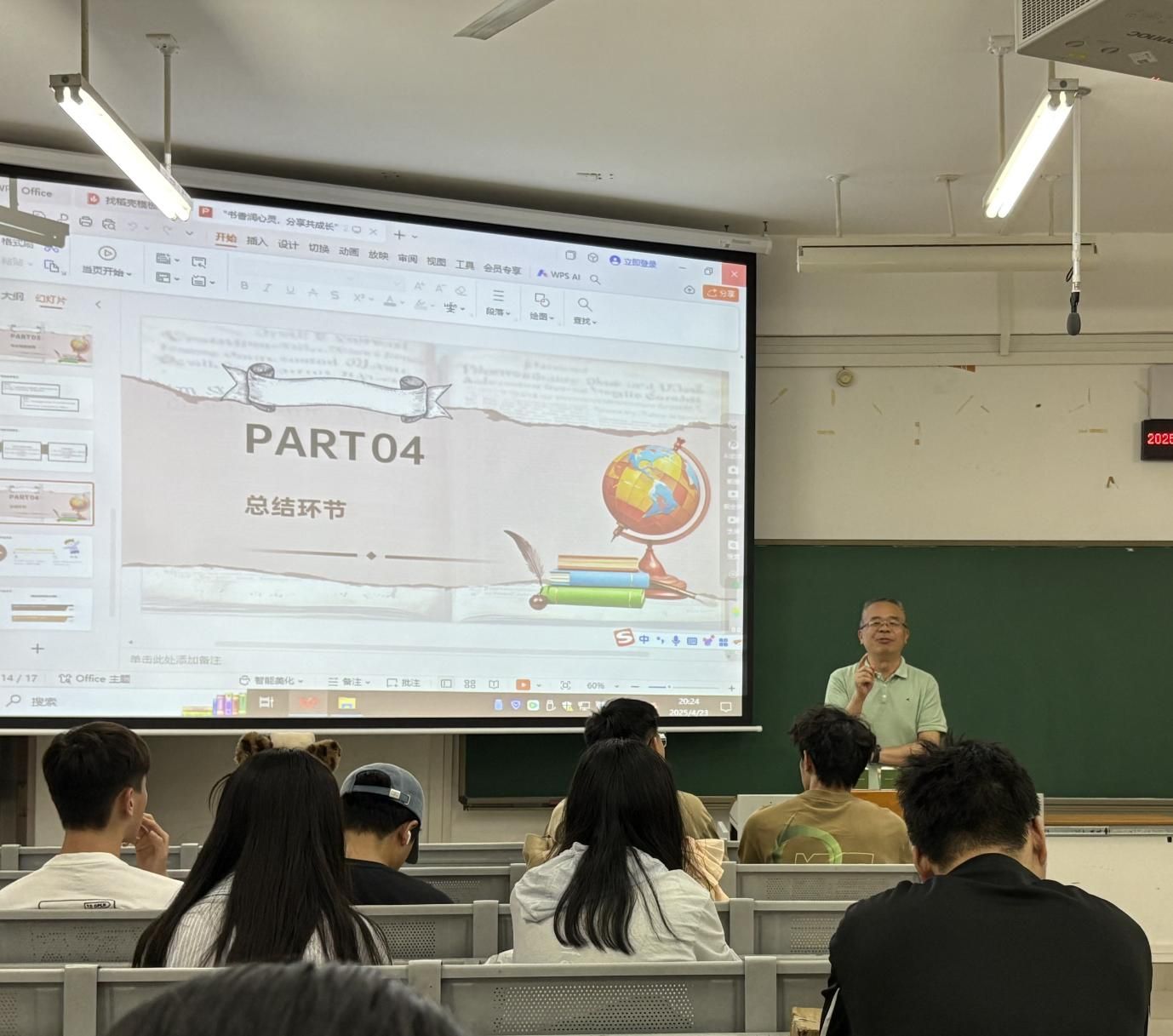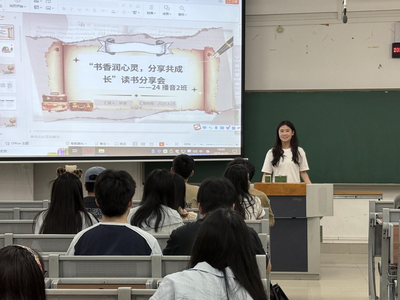 2025年4月23日晚,manbet手机app下载24播音2班在明德楼314教室举办“书香润心灵,分享共成长——思源新声”主题读书分享会。全班同学与班主任黄春平老师相聚一堂,以书为媒,在经典诵读与思想碰撞中探寻文学与播音专业的深度融合,以“思源新声”为引,营造了“以书润心、以声传情”的浓厚氛围,开启一场传承与创新交织的声音之旅 。