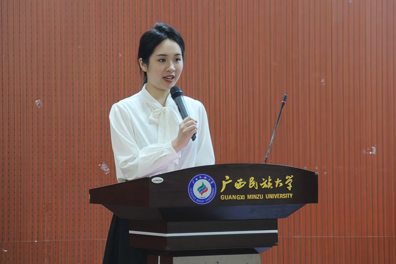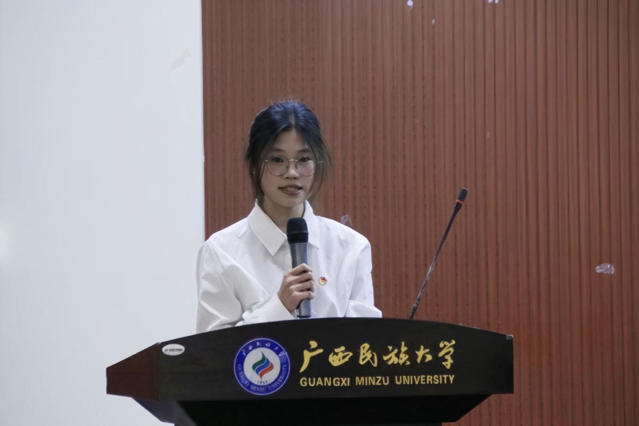 其次,2024级广播电视编导专业1班陆晓妮作为入党积极分子代表进行发言。她结合广西党员抗旱实例阐述入党初心,强调要将理论学习与社会实践结合,以身边党员为榜样。同时呼吁同学们在专业学习、志愿服务中锤炼党性,矢志为民族复兴贡献青春力量。