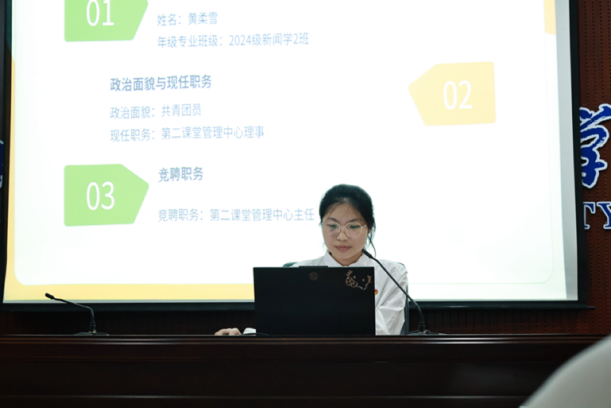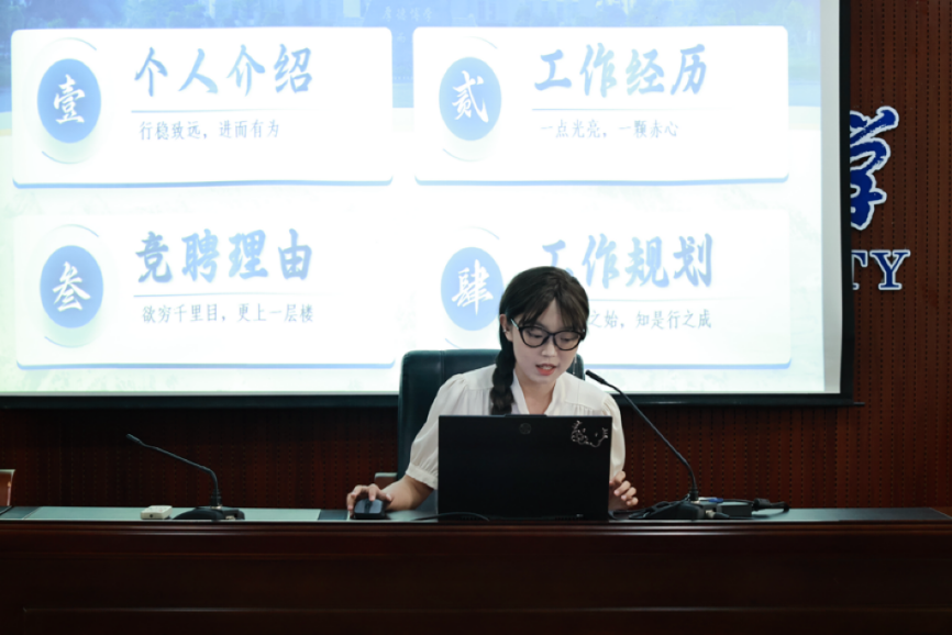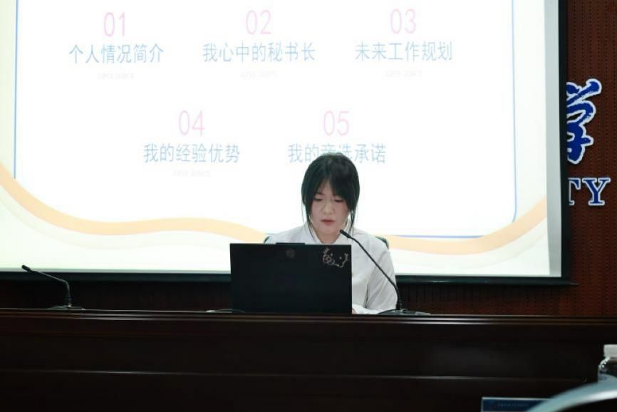 竞聘演讲环节,候选人依次上台进行演讲,阐述了自己的优势、工作经验以及对未来工作的规划和展望,充分展现了他们的能力与担当。在场师生认真聆听了每一位竞聘候选人的发言。他们从竞聘候选人的综合素质、工作能力、团队合作精神等多个方面进行考量划票,力求选出最有能力、最适合的人选。