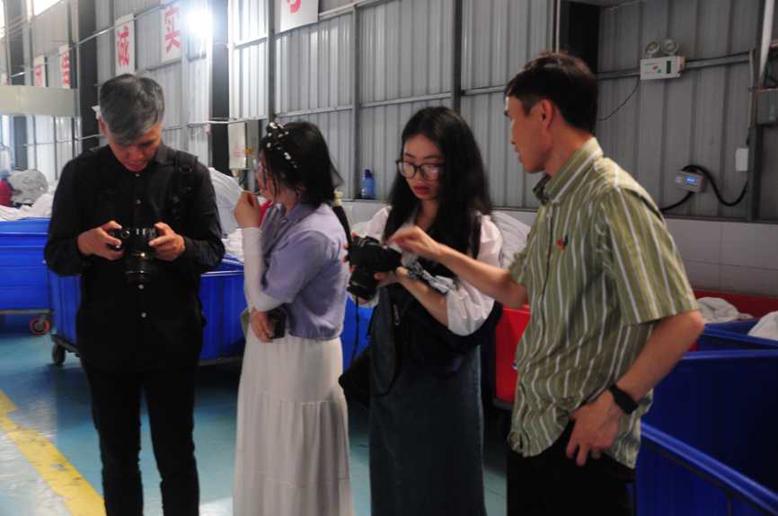 同学们集合后,万益杰、胡洁虹、李荣胜老师分别从拍摄主题、拍摄技巧、注意事项等方面与同学进行的交流。随后,师生在公司主管的引领下,深入车间一线,实地感受企业党建引领下的无障碍工作环境与人性化管理。镜头定格下,整洁明亮的生产线、专注工作的听障员工、井然有序的生产设备,构成了一幅劳动者赞歌,生动诠释了听障工人在党组织关怀下的自强不息与敬业奉献。