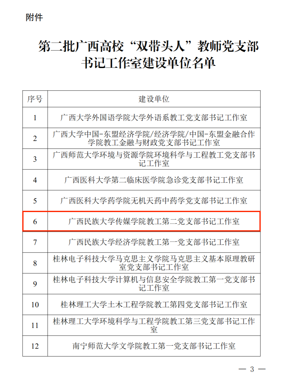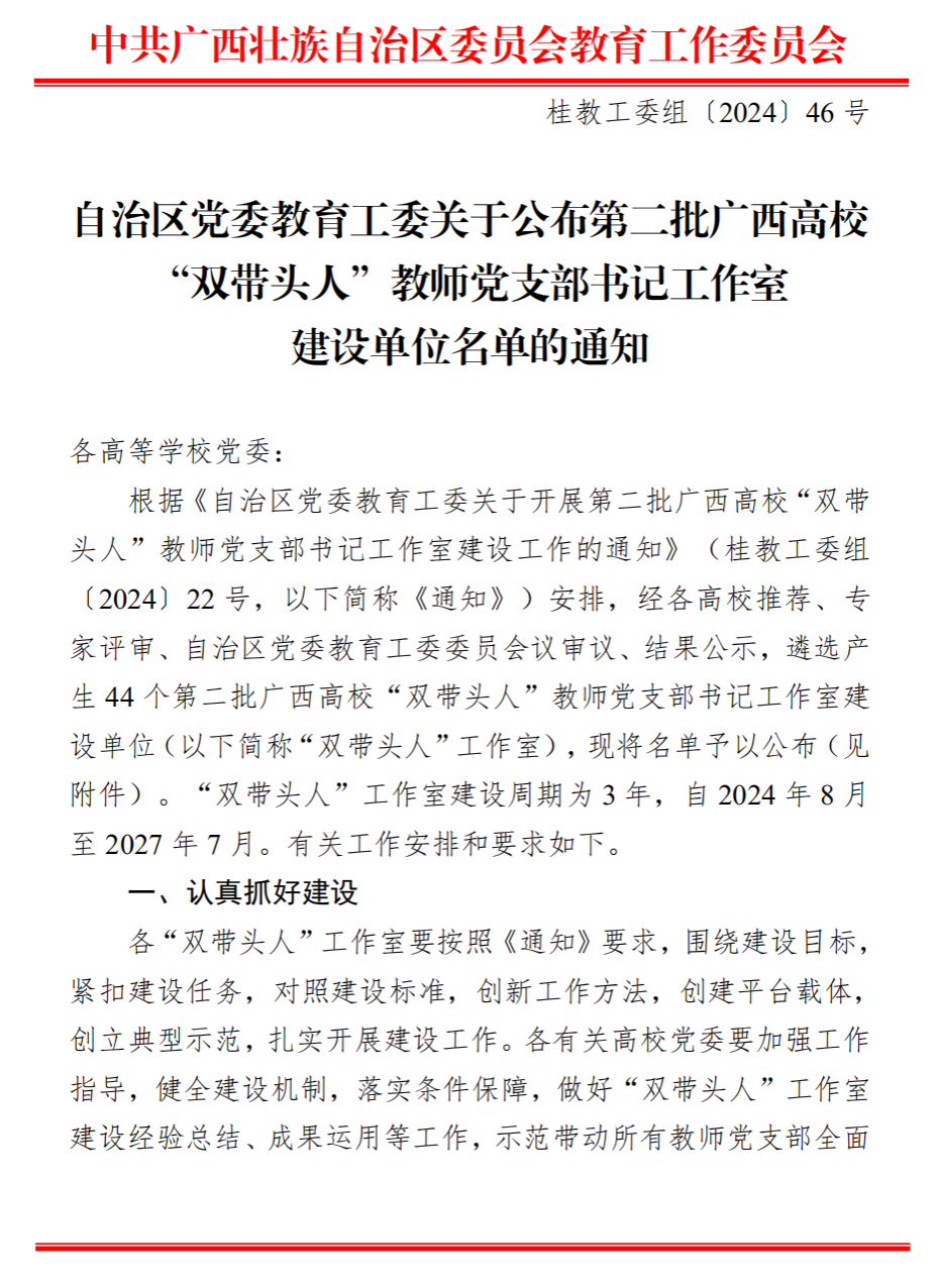 日前,自治区党委教育工委正式公布了第二批广西高校“双带头人”教师党支部书记工作室建设单位名单,manbet手机app下载教工第二党支部成功入选。