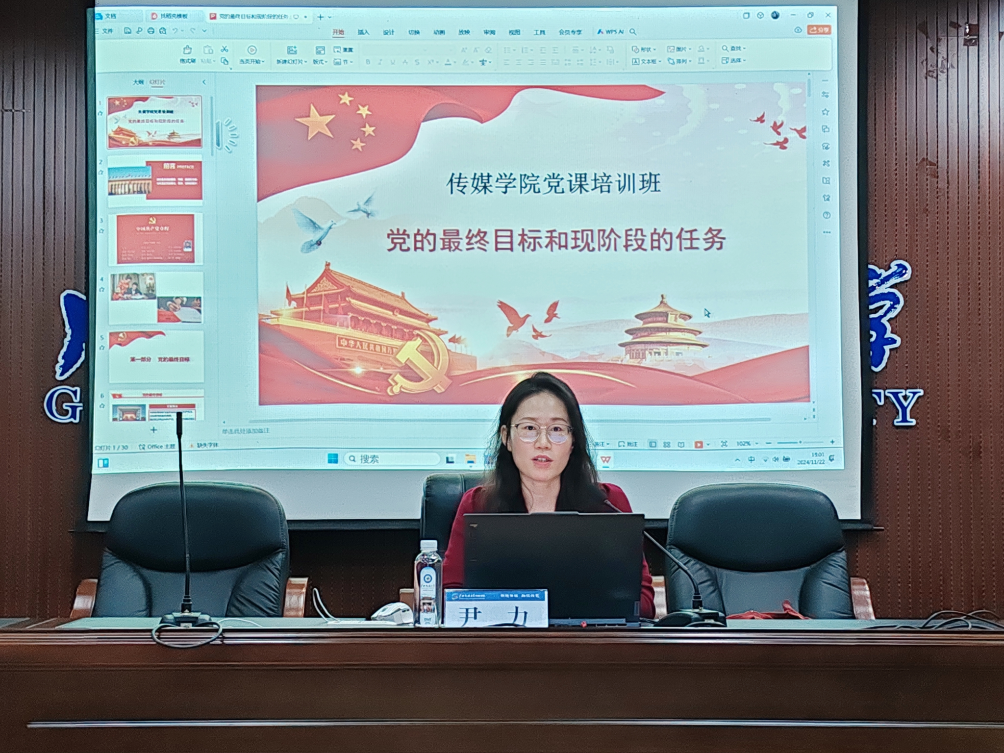 11月22日,教工第二党支部书记尹力在明德楼531学院报告厅为入党发展对象上了一堂生动而深刻的党课。本次党课的主题是“党的最终目标和现阶段的任务”,旨在帮助入党发展对象更好地理解党的奋斗历程、坚定理想信念,明确个人在党和国家事业发展中的责任和使命。